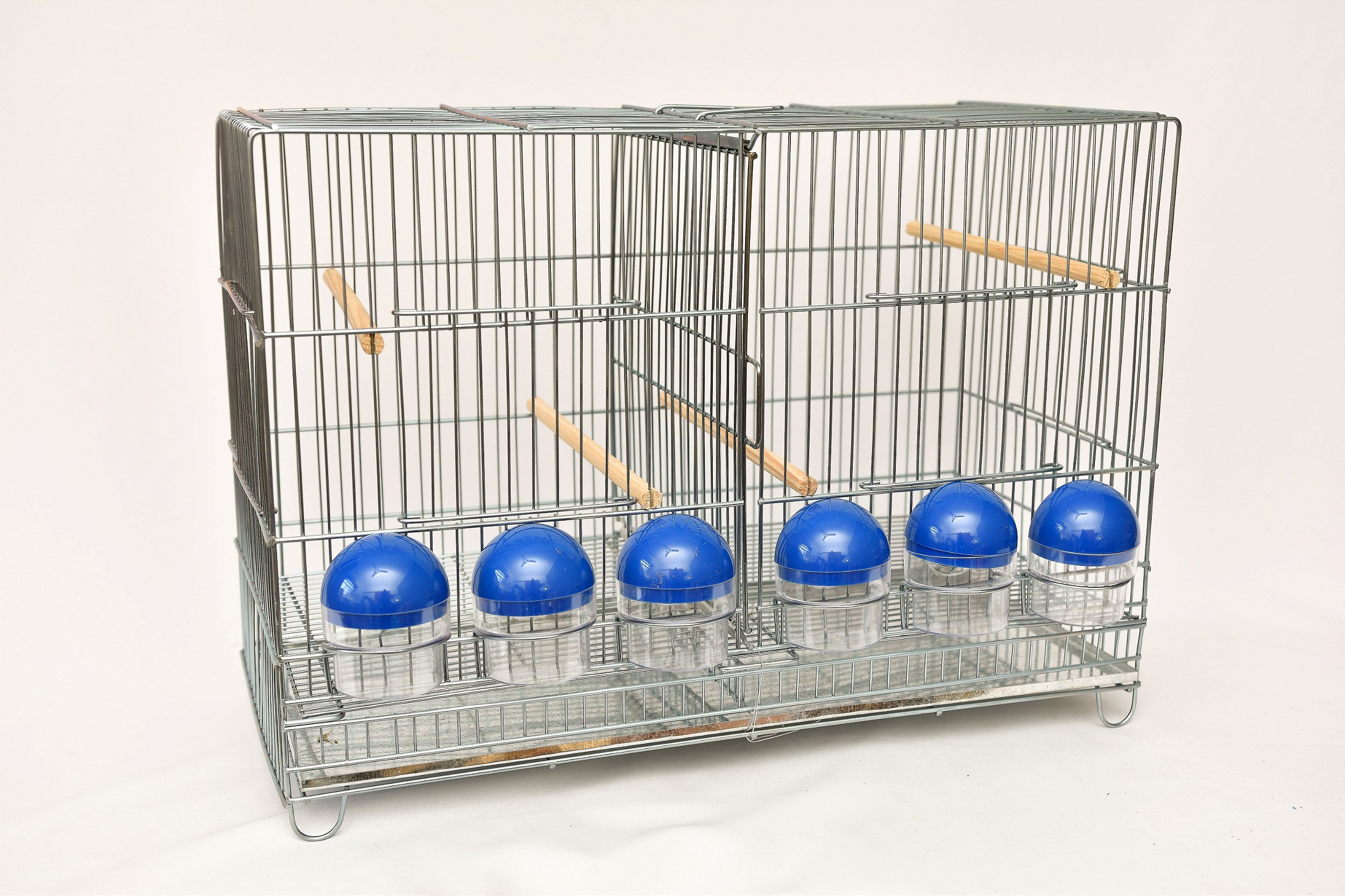 Gaiola, 4 poleiros, 06 comedouros e bandeja para recolhimento de fezes.